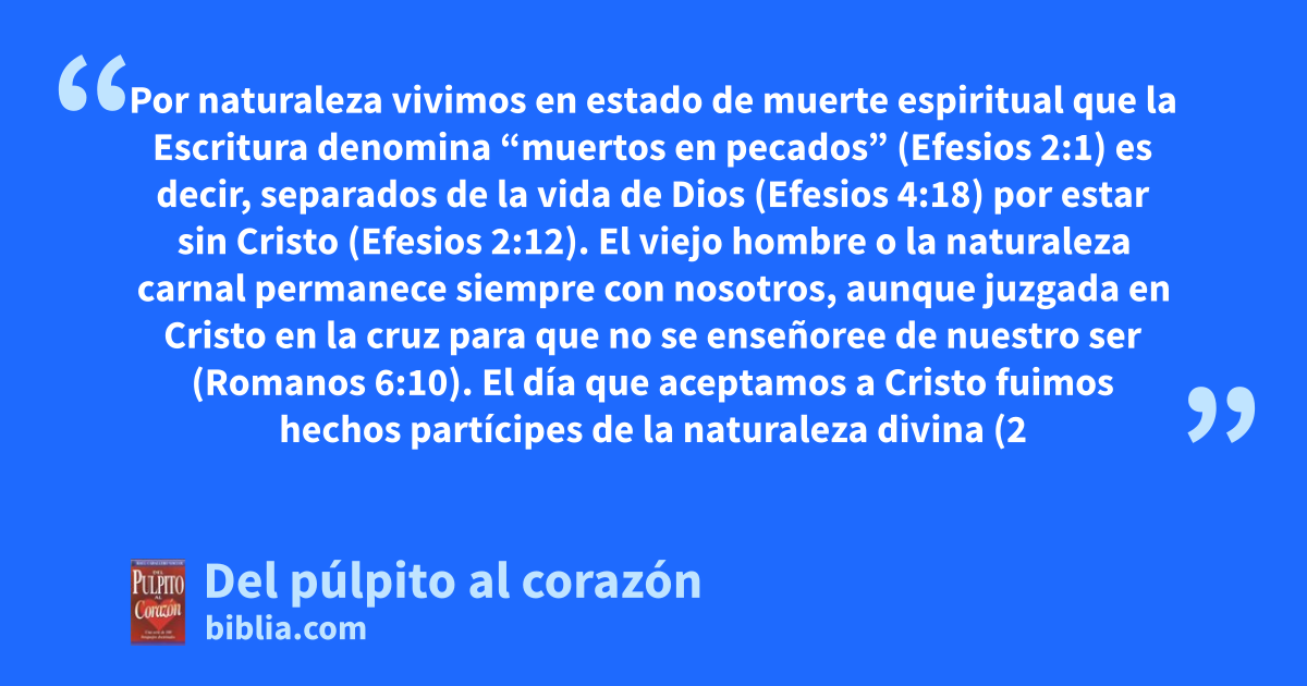 Por naturaleza vivimos en estado de muerte espiritual que la Escritura denomina “muertos en pecados” (Efesios 2:1) es decir, separados de la vida de Dios (Efesios 4:18) por estar sin Cristo (Efesios 2:12). El viejo hombre o la naturaleza carnal permanece siempre con nosotros, aunque juzgada en Cristo en la cruz para que no se enseñoree de nuestro ser (Romanos 6:10). El día que aceptamos a Cristo fuimos hechos partícipes de la naturaleza divina (2