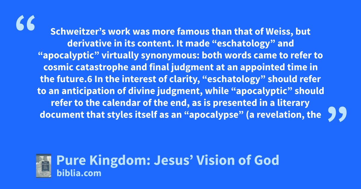 Schweitzer’s work was more famous than that of Weiss, but derivative in its content. It made “eschatology” and “apocalyptic” virtually synonymous: both words came to refer to cosmic catastrophe and final judgment at an appointed time in the future.6 In the interest of clarity, “eschatology” should refer to an anticipation of divine judgment, while “apocalyptic” should refer to the calendar of the end, as is presented in a literary document that styles itself as an “apocalypse” (a revelation, the