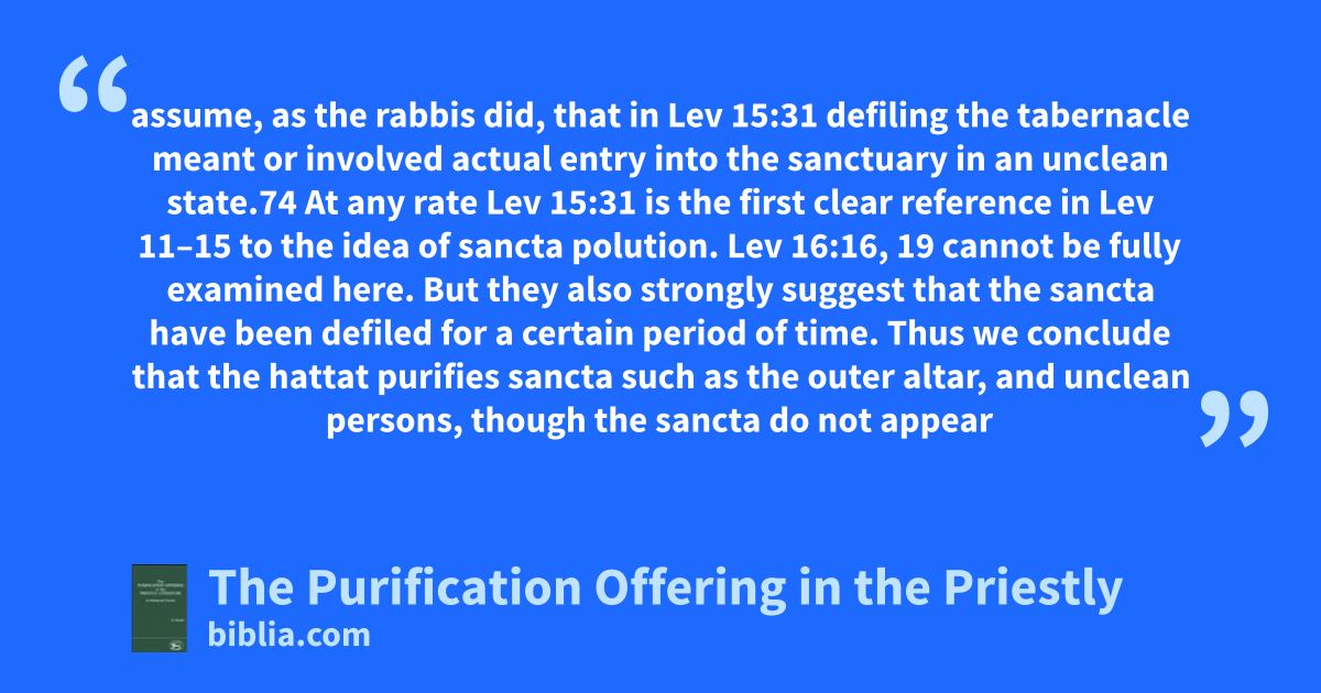 assume, as the rabbis did, that in Lev 15:31 defiling the tabernacle meant or involved actual entry into the sanctuary in an unclean state.74 At any rate Lev 15:31 is the first clear reference in Lev 11–15 to the idea of sancta polution. Lev 16:16, 19 cannot be fully examined here. But they also strongly suggest that the sancta have been defiled for a certain period of time. Thus we conclude that the hattat purifies sancta such as the outer altar, and unclean persons, though the sancta do not appear