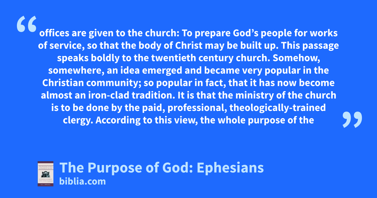 offices are given to the church: To prepare God’s people for works of service, so that the body of Christ may be built up. This passage speaks boldly to the twentieth century church. Somehow, somewhere, an idea emerged and became very popular in the Christian community; so popular in fact, that it has now become almost an iron-clad tradition. It is that the ministry of the church is to be done by the paid, professional, theologically-trained clergy. According to this view, the whole purpose of the