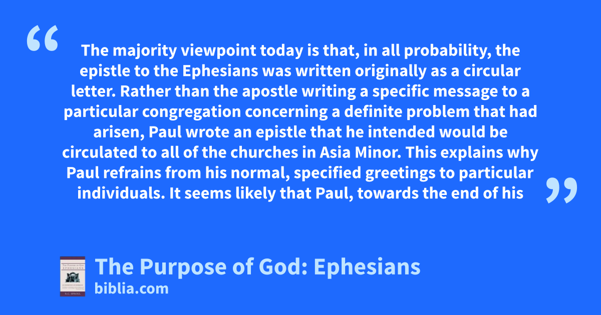 The majority viewpoint today is that, in all probability, the epistle to the Ephesians was written originally as a circular letter. Rather than the apostle writing a specific message to a particular congregation concerning a definite problem that had arisen, Paul wrote an epistle that he intended would be circulated to all of the churches in Asia Minor. This explains why Paul refrains from his normal, specified greetings to particular individuals. It seems likely that Paul, towards the end of his