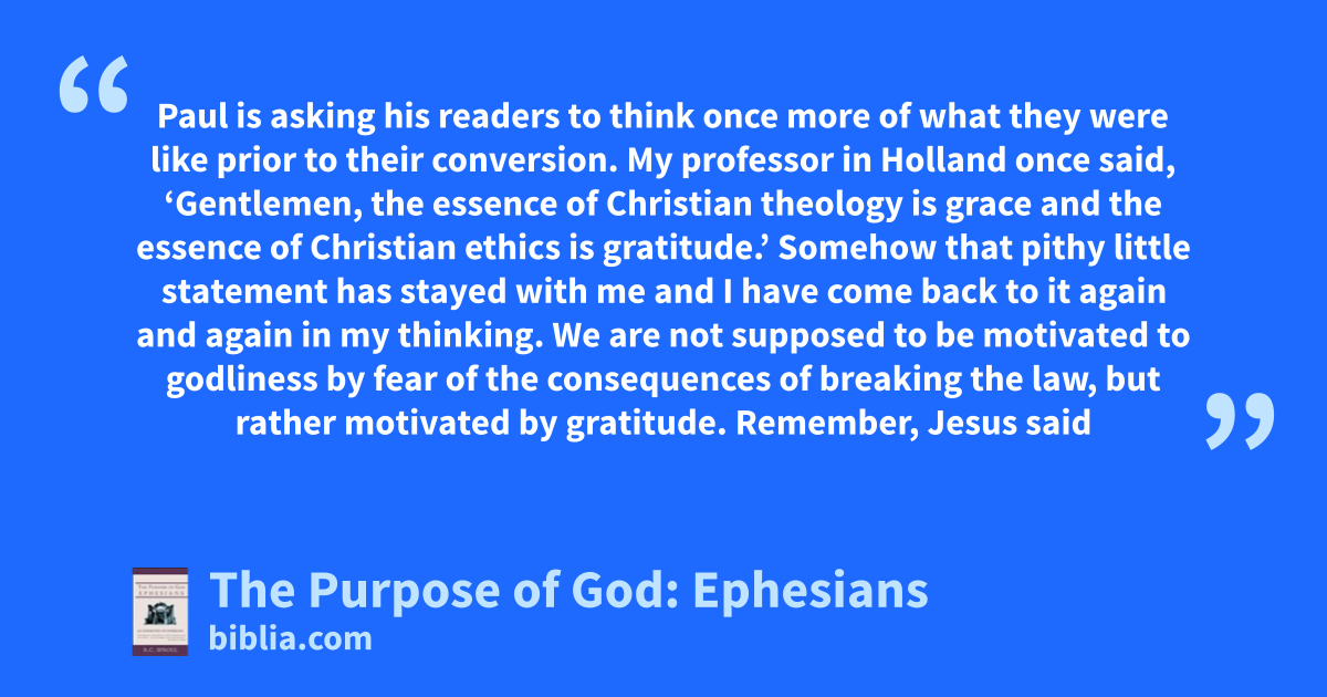 Paul is asking his readers to think once more of what they were like prior to their conversion. My professor in Holland once said, ‘Gentlemen, the essence of Christian theology is grace and the essence of Christian ethics is gratitude.’ Somehow that pithy little statement has stayed with me and I have come back to it again and again in my thinking. We are not supposed to be motivated to godliness by fear of the consequences of breaking the law, but rather motivated by gratitude. Remember, Jesus said
