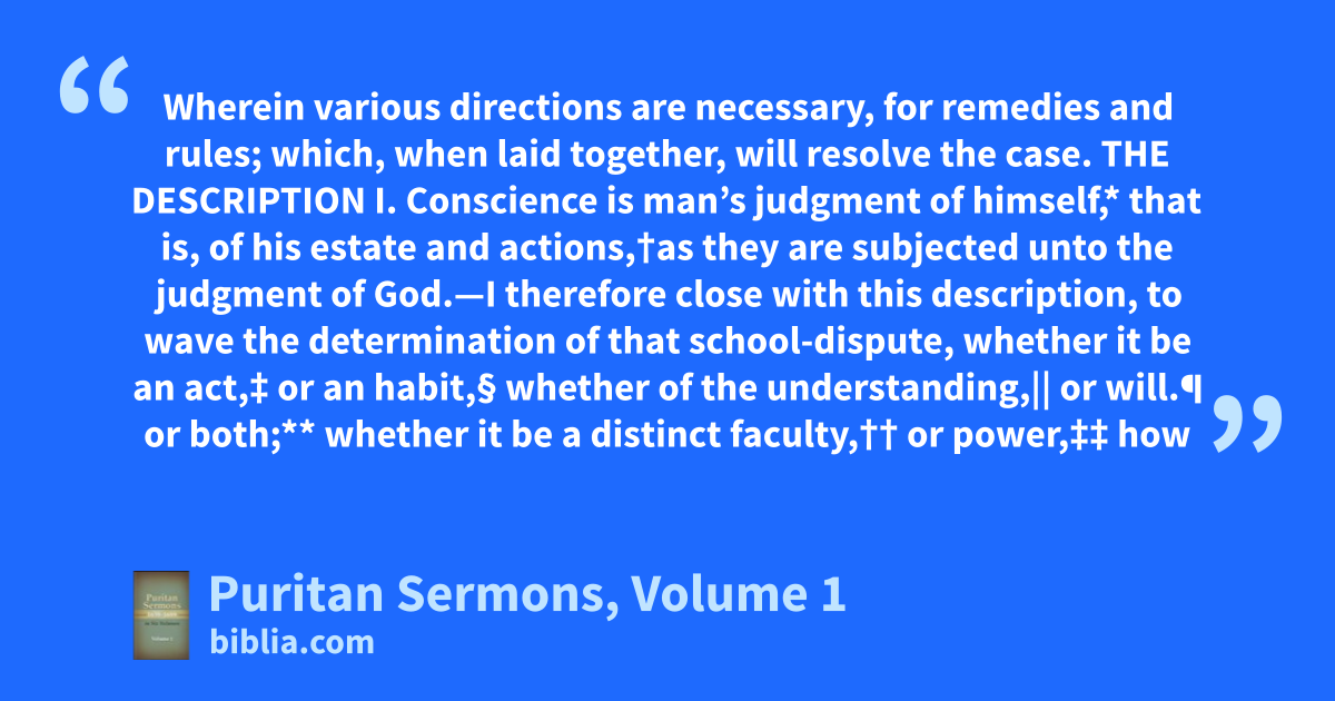 Wherein various directions are necessary, for remedies and rules; which, when laid together, will resolve the case. THE DESCRIPTION I. Conscience is man’s judgment of himself,* that is, of his estate and actions,†as they are subjected unto the judgment of God.—I therefore close with this description, to wave the determination of that school-dispute, whether it be an act,‡ or an habit,§ whether of the understanding,|| or will.¶ or both;** whether it be a distinct faculty,†† or power,‡‡ how