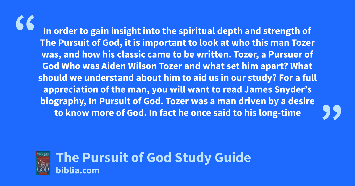 In order to gain insight into the spiritual depth and strength of The Pursuit of God, it is important to look at who this man Tozer was, and how his classic came to be written. Tozer, a Pursuer of God Who was Aiden Wilson Tozer and what set him apart? What should we understand about him to aid us in our study? For a full appreciation of the man, you will want to read James Snyder’s biography, In Pursuit of God. Tozer was a man driven by a desire to know more of God. In fact he once said to his long-time