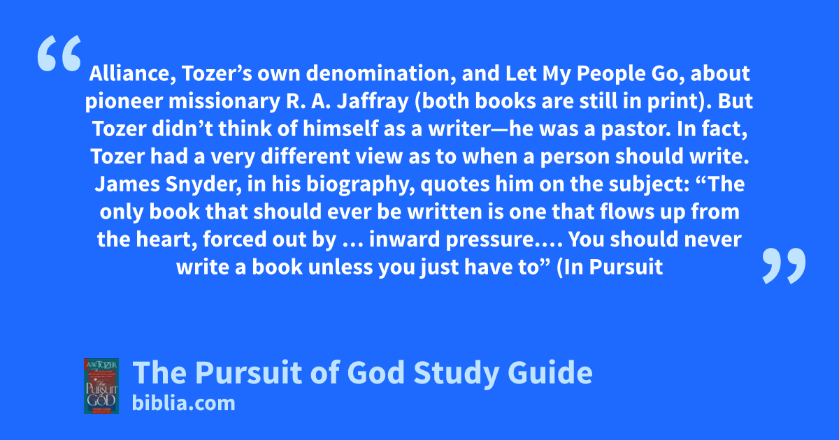 Alliance, Tozer’s own denomination, and Let My People Go, about pioneer missionary R. A. Jaffray (both books are still in print). But Tozer didn’t think of himself as a writer—he was a pastor. In fact, Tozer had a very different view as to when a person should write. James Snyder, in his biography, quotes him on the subject: “The only book that should ever be written is one that flows up from the heart, forced out by … inward pressure.… You should never write a book unless you just have to” (In Pursuit