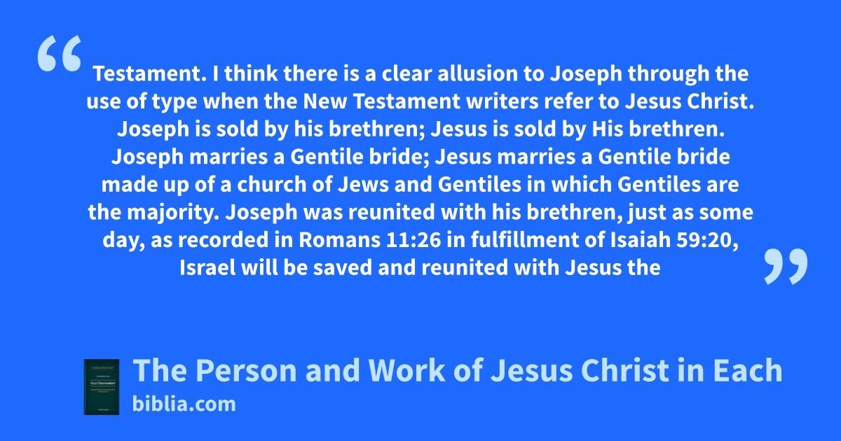 Testament. I think there is a clear allusion to Joseph through the use of type when the New Testament writers refer to Jesus Christ. Joseph is sold by his brethren; Jesus is sold by His brethren. Joseph marries a Gentile bride; Jesus marries a Gentile bride made up of a church of Jews and Gentiles in which Gentiles are the majority. Joseph was reunited with his brethren, just as some day, as recorded in Romans 11:26 in fulfillment of Isaiah 59:20, Israel will be saved and reunited with Jesus the