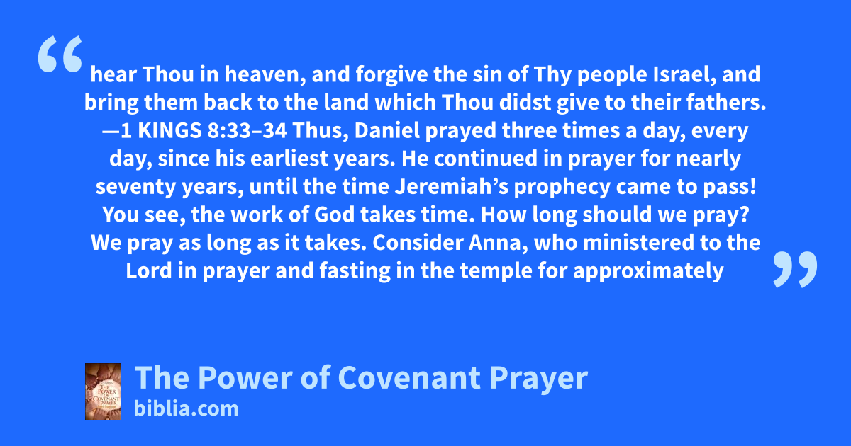 hear Thou in heaven, and forgive the sin of Thy people Israel, and bring them back to the land which Thou didst give to their fathers. —1 KINGS 8:33–34 Thus, Daniel prayed three times a day, every day, since his earliest years. He continued in prayer for nearly seventy years, until the time Jeremiah’s prophecy came to pass! You see, the work of God takes time. How long should we pray? We pray as long as it takes. Consider Anna, who ministered to the Lord in prayer and fasting in the temple for approximately