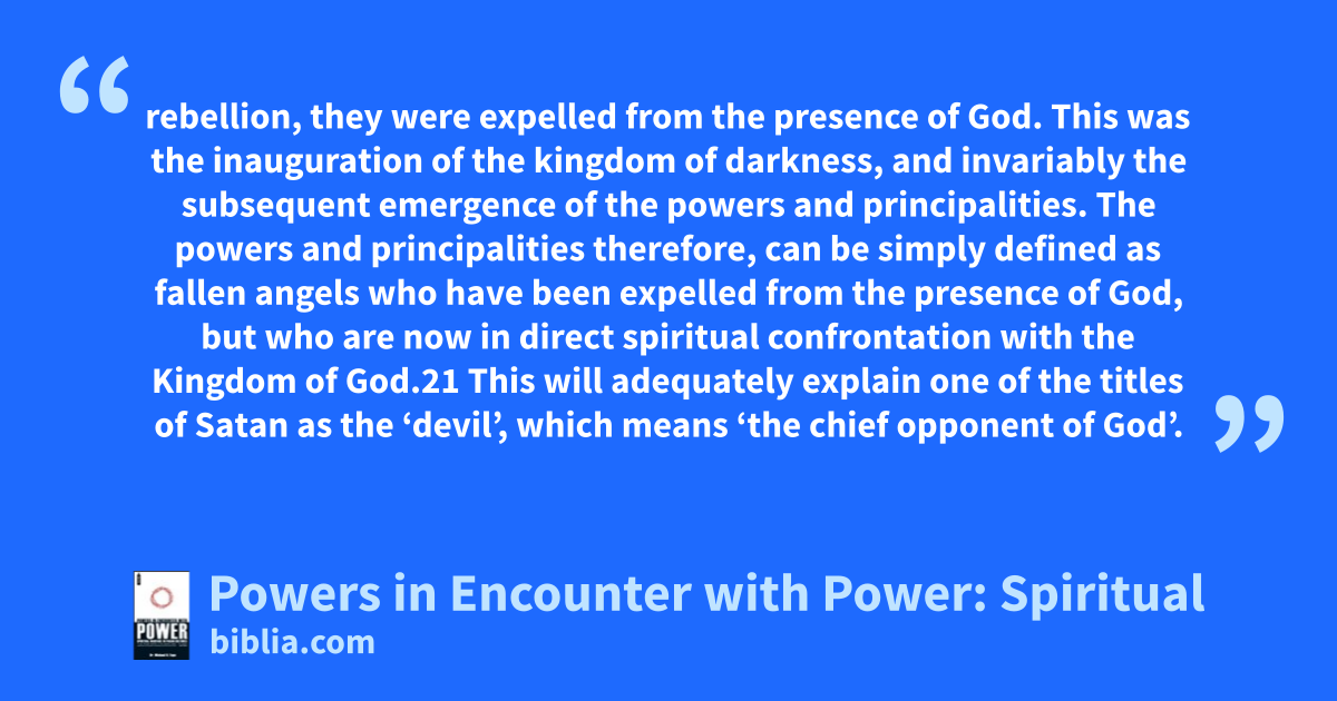 rebellion, they were expelled from the presence of God. This was the inauguration of the kingdom of darkness, and invariably the subsequent emergence of the powers and principalities. The powers and principalities therefore, can be simply defined as fallen angels who have been expelled from the presence of God, but who are now in direct spiritual confrontation with the Kingdom of God.21 This will adequately explain one of the titles of Satan as the ‘devil’, which means ‘the chief opponent of God’.