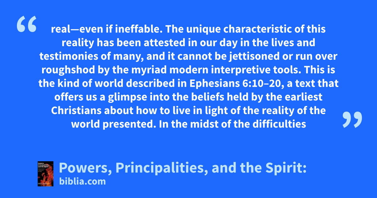 real—even if ineffable. The unique characteristic of this reality has been attested in our day in the lives and testimonies of many, and it cannot be jettisoned or run over roughshod by the myriad modern interpretive tools. This is the kind of world described in Ephesians 6:10–20, a text that offers us a glimpse into the beliefs held by the earliest Christians about how to live in light of the reality of the world presented. In the midst of the difficulties