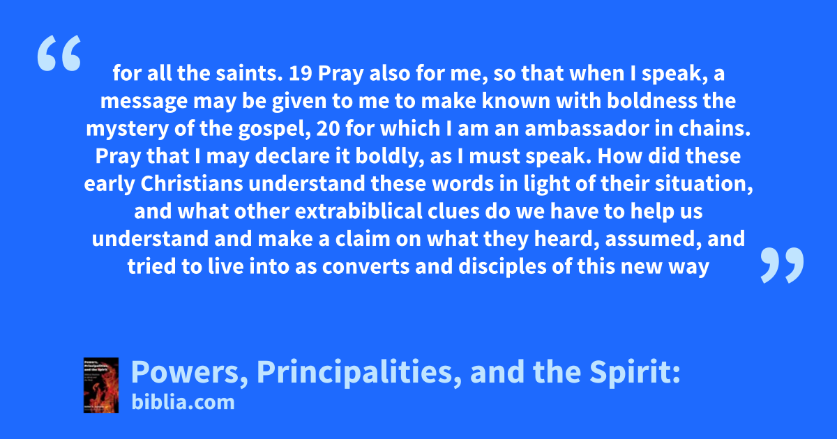for all the saints. 19 Pray also for me, so that when I speak, a message may be given to me to make known with boldness the mystery of the gospel, 20 for which I am an ambassador in chains. Pray that I may declare it boldly, as I must speak. How did these early Christians understand these words in light of their situation, and what other extrabiblical clues do we have to help us understand and make a claim on what they heard, assumed, and tried to live into as converts and disciples of this new way