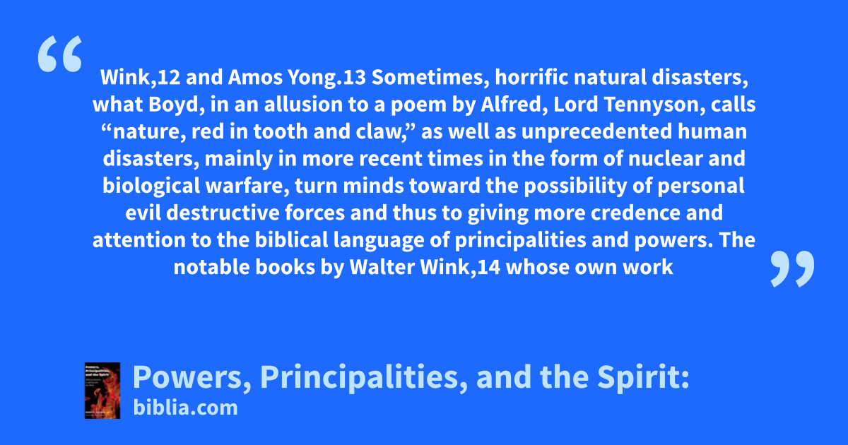 Wink,12 and Amos Yong.13 Sometimes, horrific natural disasters, what Boyd, in an allusion to a poem by Alfred, Lord Tennyson, calls “nature, red in tooth and claw,” as well as unprecedented human disasters, mainly in more recent times in the form of nuclear and biological warfare, turn minds toward the possibility of personal evil destructive forces and thus to giving more credence and attention to the biblical language of principalities and powers. The notable books by Walter Wink,14 whose own work