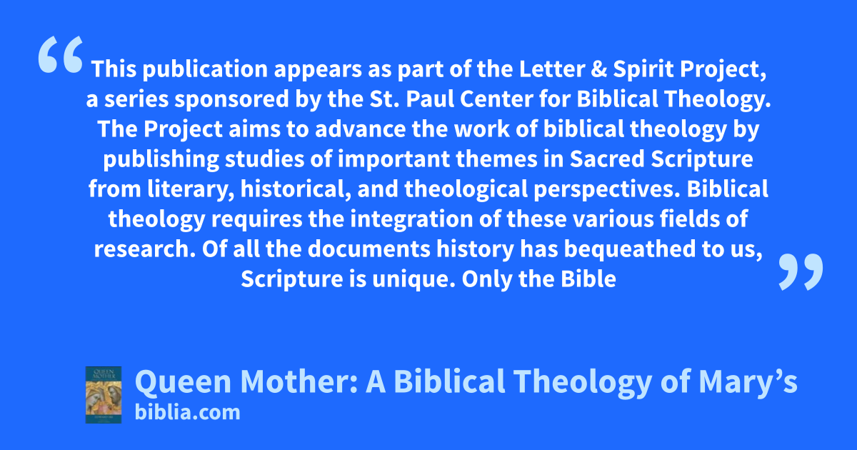This publication appears as part of the Letter & Spirit Project, a series sponsored by the St. Paul Center for Biblical Theology. The Project aims to advance the work of biblical theology by publishing studies of important themes in Sacred Scripture from literary, historical, and theological perspectives. Biblical theology requires the integration of these various fields of research. Of all the documents history has bequeathed to us, Scripture is unique. Only the Bible