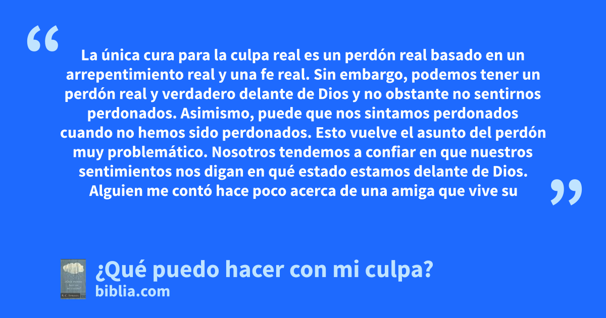 La única cura para la culpa real es un perdón real basado en un arrepentimiento real y una fe real. Sin embargo, podemos tener un perdón real y verdadero delante de Dios y no obstante no sentirnos perdonados. Asimismo, puede que nos sintamos perdonados cuando no hemos sido perdonados. Esto vuelve el asunto del perdón muy problemático. Nosotros tendemos a confiar en que nuestros sentimientos nos digan en qué estado estamos delante de Dios. Alguien me contó hace poco acerca de una amiga que vive su