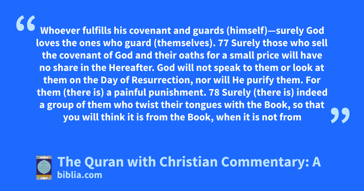 Whoever fulfills his covenant and guards (himself)—surely God loves the ones who guard (themselves). 77 Surely those who sell the covenant of God and their oaths for a small price will have no share in the Hereafter. God will not speak to them or look at them on the Day of Resurrection, nor will He purify them. For them (there is) a painful punishment. 78 Surely (there is) indeed a group of them who twist their tongues with the Book, so that you will think it is from the Book, when it is not from