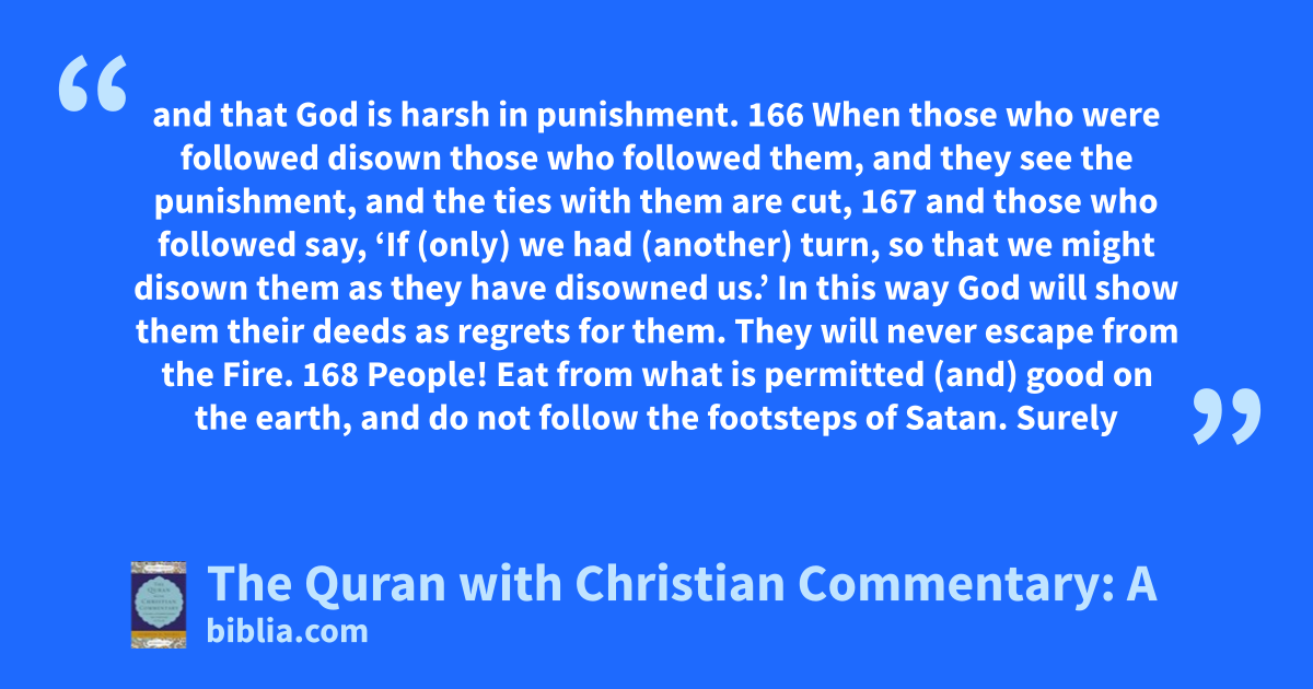 and that God is harsh in punishment. 166 When those who were followed disown those who followed them, and they see the punishment, and the ties with them are cut, 167 and those who followed say, ‘If (only) we had (another) turn, so that we might disown them as they have disowned us.’ In this way God will show them their deeds as regrets for them. They will never escape from the Fire. 168 People! Eat from what is permitted (and) good on the earth, and do not follow the footsteps of Satan. Surely