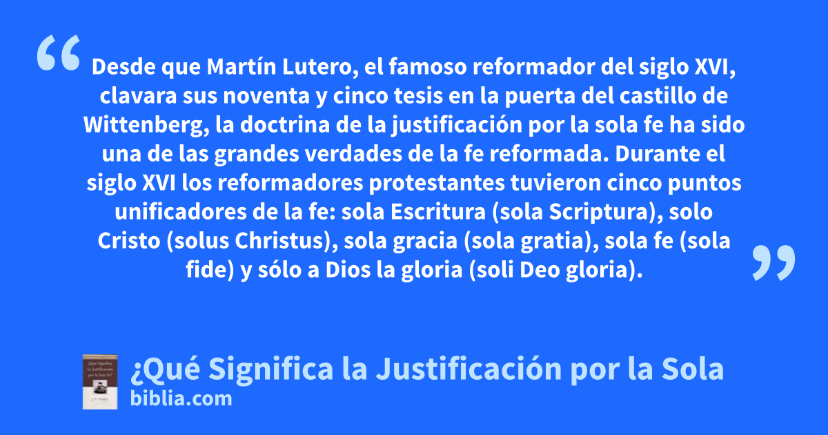 Desde que Martín Lutero, el famoso reformador del siglo XVI, clavara sus noventa y cinco tesis en la puerta del castillo de Wittenberg, la doctrina de la justificación por la sola fe ha sido una de las grandes verdades de la fe reformada. Durante el siglo XVI los reformadores protestantes tuvieron cinco puntos unificadores de la fe: sola Escritura (sola Scriptura), solo Cristo (solus Christus), sola gracia (sola gratia), sola fe (sola fide) y sólo a Dios la gloria (soli Deo gloria).