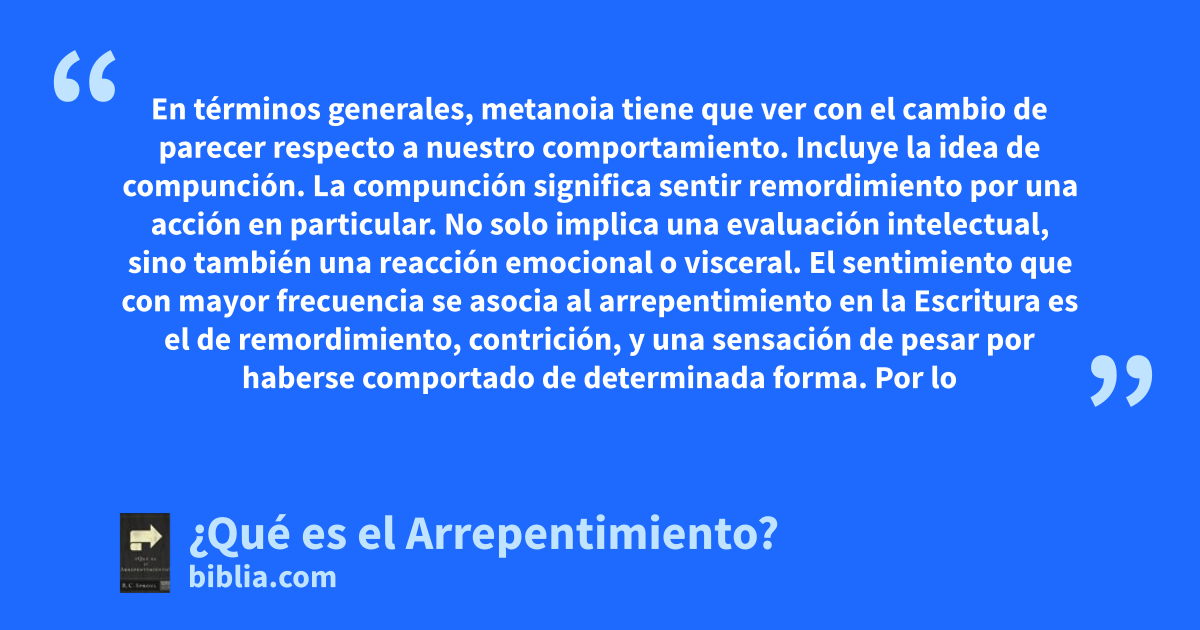 En términos generales, metanoia tiene que ver con el cambio de parecer respecto a nuestro comportamiento. Incluye la idea de compunción. La compunción significa sentir remordimiento por una acción en particular. No solo implica una evaluación intelectual, sino también una reacción emocional o visceral. El sentimiento que con mayor frecuencia se asocia al arrepentimiento en la Escritura es el de remordimiento, contrición, y una sensación de pesar por haberse comportado de determinada forma. Por lo