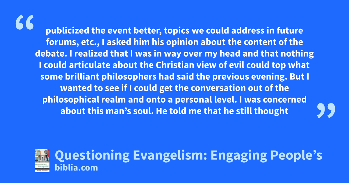 publicized the event better, topics we could address in future forums, etc., I asked him his opinion about the content of the debate. I realized that I was in way over my head and that nothing I could articulate about the Christian view of evil could top what some brilliant philosophers had said the previous evening. But I wanted to see if I could get the conversation out of the philosophical realm and onto a personal level. I was concerned about this man’s soul. He told me that he still thought