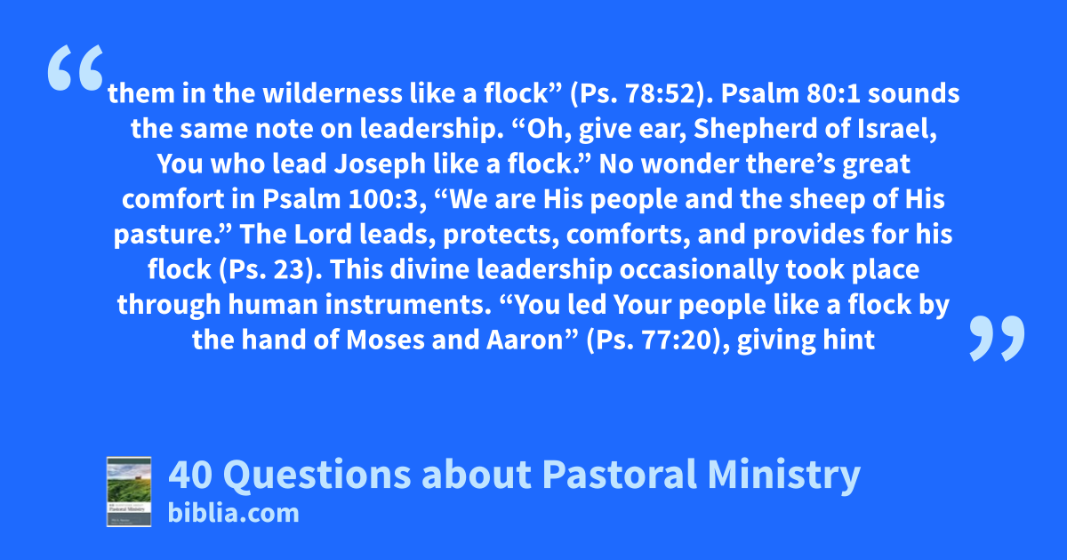 them in the wilderness like a flock” (Ps. 78:52). Psalm 80:1 sounds the same note on leadership. “Oh, give ear, Shepherd of Israel, You who lead Joseph like a flock.” No wonder there’s great comfort in Psalm 100:3, “We are His people and the sheep of His pasture.” The Lord leads, protects, comforts, and provides for his flock (Ps. 23). This divine leadership occasionally took place through human instruments. “You led Your people like a flock by the hand of Moses and Aaron” (Ps. 77:20), giving hint