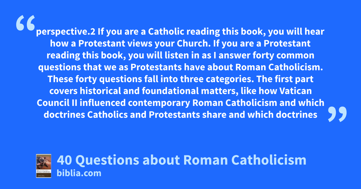 Straightforward answers about Roman Catholicism for a Protestant audience. The Roman Catholic faith is one of the world’s most widespread religious traditions, yet the unique aspects of Roman Catholicism elicit perennial questions from adherents and outsiders alike. Such questions tend to fall into three major categories: historical backgrounds, theological matters, and personal relationships....