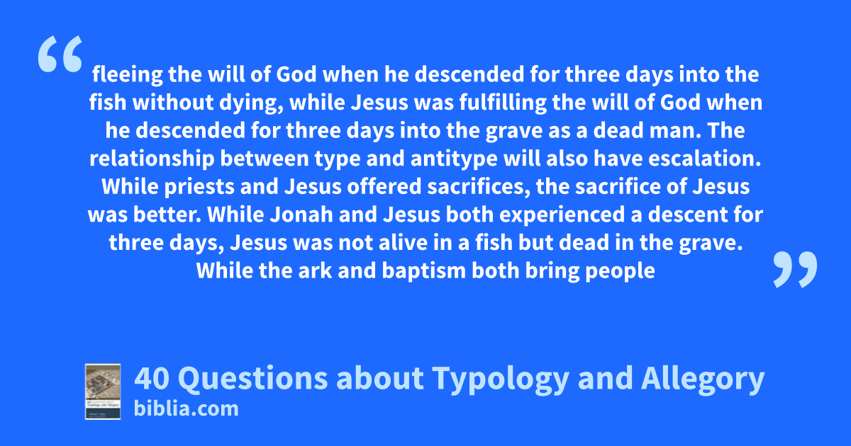 fleeing the will of God when he descended for three days into the fish without dying, while Jesus was fulfilling the will of God when he descended for three days into the grave as a dead man. The relationship between type and antitype will also have escalation. While priests and Jesus offered sacrifices, the sacrifice of Jesus was better. While Jonah and Jesus both experienced a descent for three days, Jesus was not alive in a fish but dead in the grave. While the ark and baptism both bring people