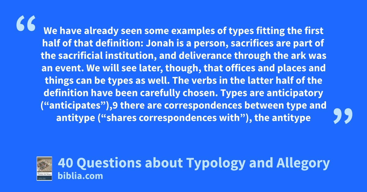 We have already seen some examples of types fitting the first half of that definition: Jonah is a person, sacrifices are part of the sacrificial institution, and deliverance through the ark was an event. We will see later, though, that offices and places and things can be types as well. The verbs in the latter half of the definition have been carefully chosen. Types are anticipatory (“anticipates”),9 there are correspondences between type and antitype (“shares correspondences with”), the antitype