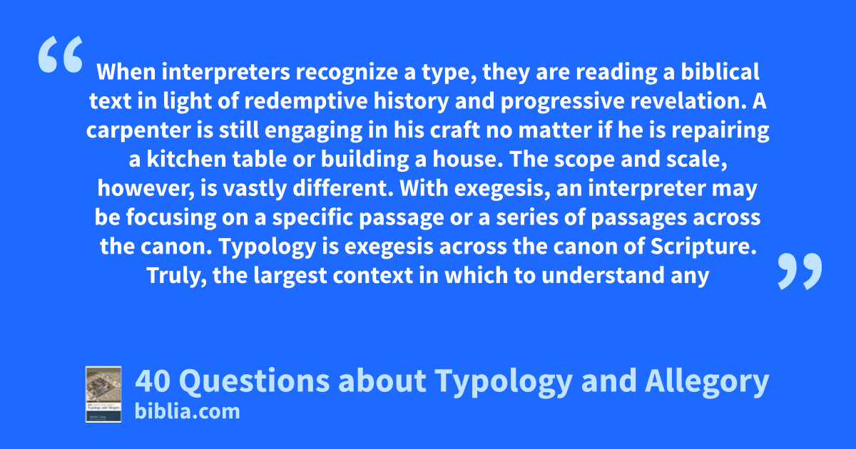 When interpreters recognize a type, they are reading a biblical text in light of redemptive history and progressive revelation. A carpenter is still engaging in his craft no matter if he is repairing a kitchen table or building a house. The scope and scale, however, is vastly different. With exegesis, an interpreter may be focusing on a specific passage or a series of passages across the canon. Typology is exegesis across the canon of Scripture. Truly, the largest context in which to understand any