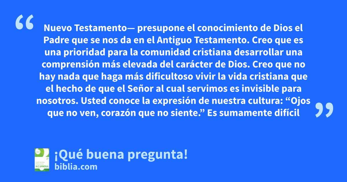 Nuevo Testamento— presupone el conocimiento de Dios el Padre que se nos da en el Antiguo Testamento. Creo que es una prioridad para la comunidad cristiana desarrollar una comprensión más elevada del carácter de Dios. Creo que no hay nada que haga más dificultoso vivir la vida cristiana que el hecho de que el Señor al cual servimos es invisible para nosotros. Usted conoce la expresión de nuestra cultura: “Ojos que no ven, corazón que no siente.” Es sumamente difícil