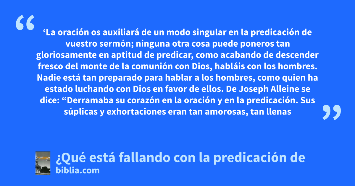 ‘La oración os auxiliará de un modo singular en la predicación de vuestro sermón; ninguna otra cosa puede poneros tan gloriosamente en aptitud de predicar, como acabando de descender fresco del monte de la comunión con Dios, habláis con los hombres. Nadie está tan preparado para hablar a los hombres, como quien ha estado luchando con Dios en favor de ellos. De Joseph Alleine se dice: “Derramaba su corazón en la oración y en la predicación. Sus súplicas y exhortaciones eran tan amorosas, tan llenas
