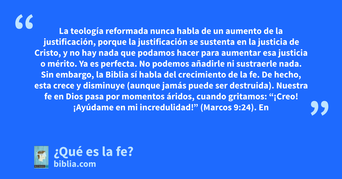 La teología reformada nunca habla de un aumento de la justificación, porque la justificación se sustenta en la justicia de Cristo, y no hay nada que podamos hacer para aumentar esa justicia o mérito. Ya es perfecta. No podemos añadirle ni sustraerle nada. Sin embargo, la Biblia sí habla del crecimiento de la fe. De hecho, esta crece y disminuye (aunque jamás puede ser destruida). Nuestra fe en Dios pasa por momentos áridos, cuando gritamos: “¡Creo! ¡Ayúdame en mi incredulidad!” (Marcos 9:24). En