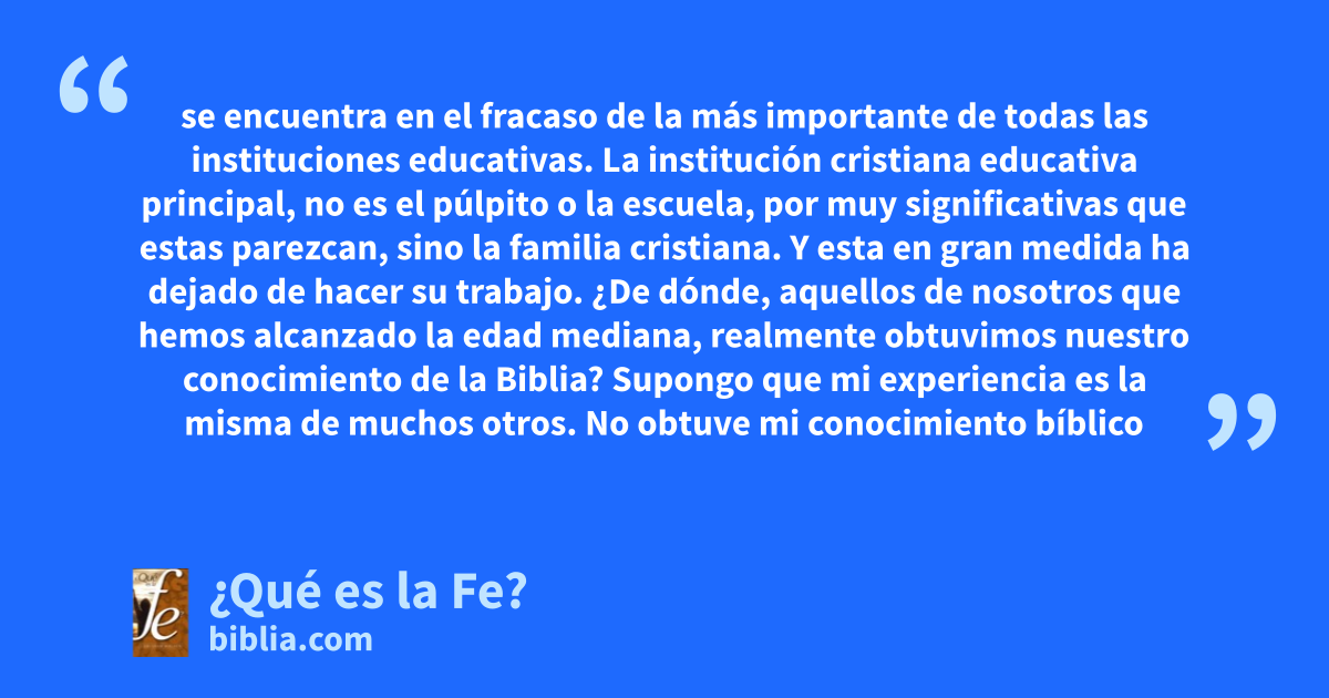 se encuentra en el fracaso de la más importante de todas las instituciones educativas. La institución cristiana educativa principal, no es el púlpito o la escuela, por muy significativas que estas parezcan, sino la familia cristiana. Y esta en gran medida ha dejado de hacer su trabajo. ¿De dónde, aquellos de nosotros que hemos alcanzado la edad mediana, realmente obtuvimos nuestro conocimiento de la Biblia? Supongo que mi experiencia es la misma de muchos otros. No obtuve mi conocimiento bíblico