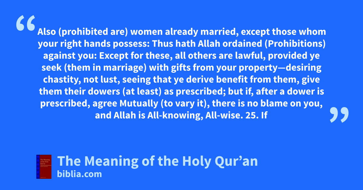 Also (prohibited are) women already married, except those whom your right hands possess: Thus hath Allah ordained (Prohibitions) against you: Except for these, all others are lawful, provided ye seek (them in marriage) with gifts from your property—desiring chastity, not lust, seeing that ye derive benefit from them, give them their dowers (at least) as prescribed; but if, after a dower is prescribed, agree Mutually (to vary it), there is no blame on you, and Allah is All-knowing, All-wise. 25. If
