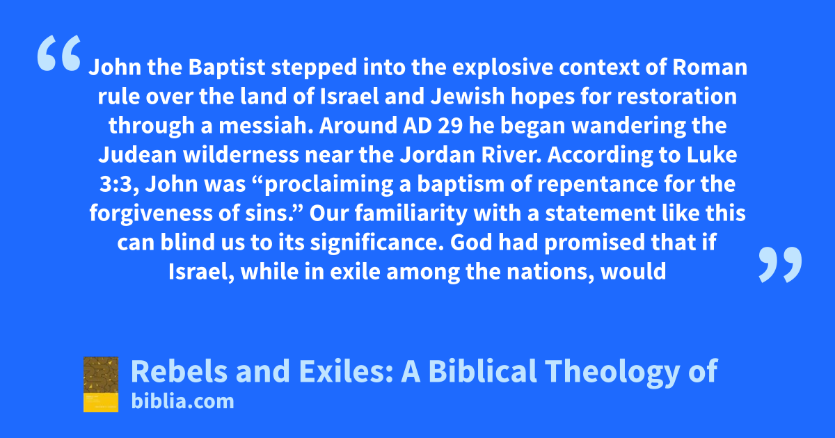 John the Baptist stepped into the explosive context of Roman rule over the land of Israel and Jewish hopes for restoration through a messiah. Around AD 29 he began wandering the Judean wilderness near the Jordan River. According to Luke 3:3, John was “proclaiming a baptism of repentance for the forgiveness of sins.” Our familiarity with a statement like this can blind us to its significance. God had promised that if Israel, while in exile among the nations, would