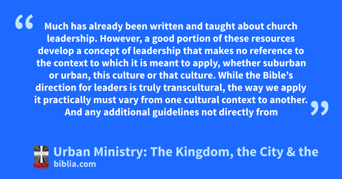 Much has already been written and taught about church leadership. However, a good portion of these resources develop a concept of leadership that makes no reference to the context to which it is meant to apply, whether suburban or urban, this culture or that culture. While the Bible’s direction for leaders is truly transcultural, the way we apply it practically must vary from one cultural context to another. And any additional guidelines not directly from