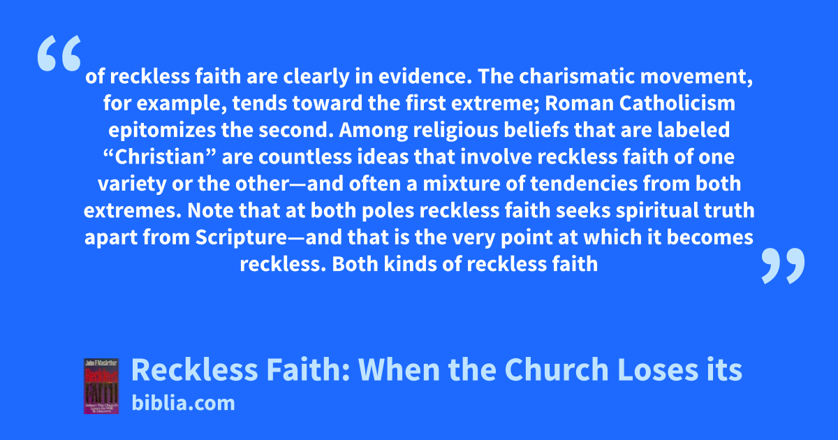of reckless faith are clearly in evidence. The charismatic movement, for example, tends toward the first extreme; Roman Catholicism epitomizes the second. Among religious beliefs that are labeled “Christian” are countless ideas that involve reckless faith of one variety or the other—and often a mixture of tendencies from both extremes. Note that at both poles reckless faith seeks spiritual truth apart from Scripture—and that is the very point at which it becomes reckless. Both kinds of reckless faith