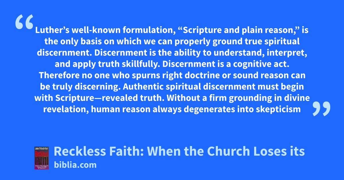 Luther’s well-known formulation, “Scripture and plain reason,” is the only basis on which we can properly ground true spiritual discernment. Discernment is the ability to understand, interpret, and apply truth skillfully. Discernment is a cognitive act. Therefore no one who spurns right doctrine or sound reason can be truly discerning. Authentic spiritual discernment must begin with Scripture—revealed truth. Without a firm grounding in divine revelation, human reason always degenerates into skepticism