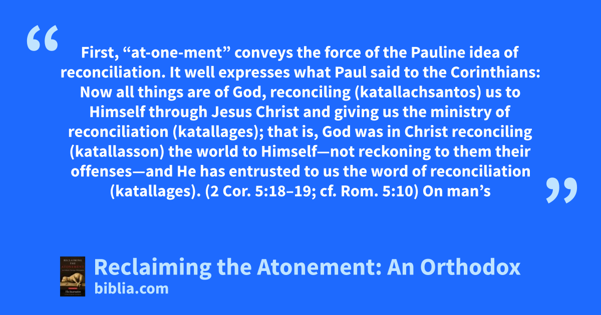 First, “at-one-ment” conveys the force of the Pauline idea of reconciliation. It well expresses what Paul said to the Corinthians: Now all things are of God, reconciling (katallachsantos) us to Himself through Jesus Christ and giving us the ministry of reconciliation (katallages); that is, God was in Christ reconciling (katallasson) the world to Himself—not reckoning to them their offenses—and He has entrusted to us the word of reconciliation (katallages). (2 Cor. 5:18–19; cf. Rom. 5:10) On man’s