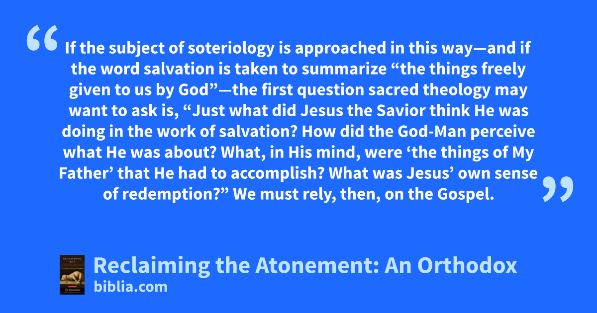 If the subject of soteriology is approached in this way—and if the word salvation is taken to summarize “the things freely given to us by God”—the first question sacred theology may want to ask is, “Just what did Jesus the Savior think He was doing in the work of salvation? How did the God-Man perceive what He was about? What, in His mind, were ‘the things of My Father’ that He had to accomplish? What was Jesus’ own sense of redemption?” We must rely, then, on the Gospel.
