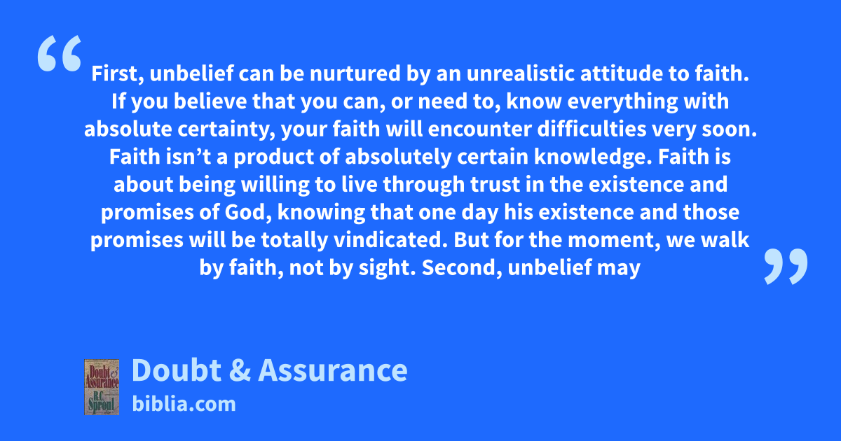 First, unbelief can be nurtured by an unrealistic attitude to faith. If you believe that you can, or need to, know everything with absolute certainty, your faith will encounter difficulties very soon. Faith isn’t a product of absolutely certain knowledge. Faith is about being willing to live through trust in the existence and promises of God, knowing that one day his existence and those promises will be totally vindicated. But for the moment, we walk by faith, not by sight. Second, unbelief may