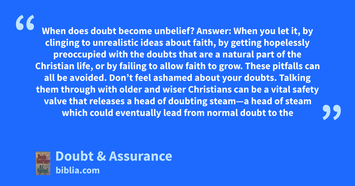 When does doubt become unbelief? Answer: When you let it, by clinging to unrealistic ideas about faith, by getting hopelessly preoccupied with the doubts that are a natural part of the Christian life, or by failing to allow faith to grow. These pitfalls can all be avoided. Don’t feel ashamed about your doubts. Talking them through with older and wiser Christians can be a vital safety valve that releases a head of doubting steam—a head of steam which could eventually lead from normal doubt to the