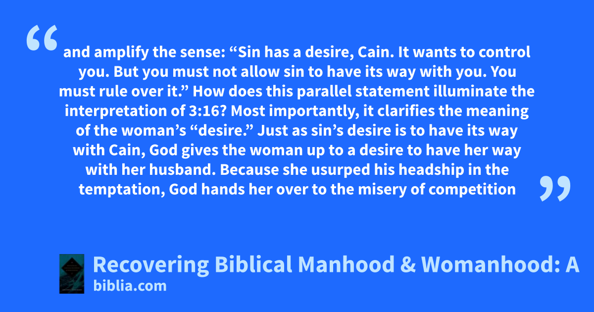 and amplify the sense: “Sin has a desire, Cain. It wants to control you. But you must not allow sin to have its way with you. You must rule over it.” How does this parallel statement illuminate the interpretation of 3:16? Most importantly, it clarifies the meaning of the woman’s “desire.” Just as sin’s desire is to have its way with Cain, God gives the woman up to a desire to have her way with her husband. Because she usurped his headship in the temptation, God hands her over to the misery of competition