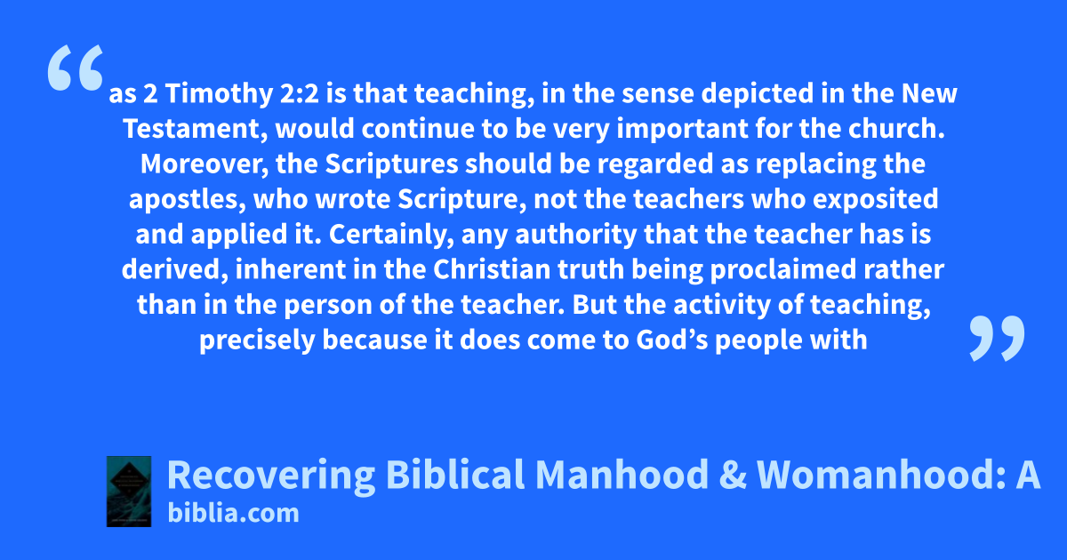 as 2 Timothy 2:2 is that teaching, in the sense depicted in the New Testament, would continue to be very important for the church. Moreover, the Scriptures should be regarded as replacing the apostles, who wrote Scripture, not the teachers who exposited and applied it. Certainly, any authority that the teacher has is derived, inherent in the Christian truth being proclaimed rather than in the person of the teacher. But the activity of teaching, precisely because it does come to God’s people with