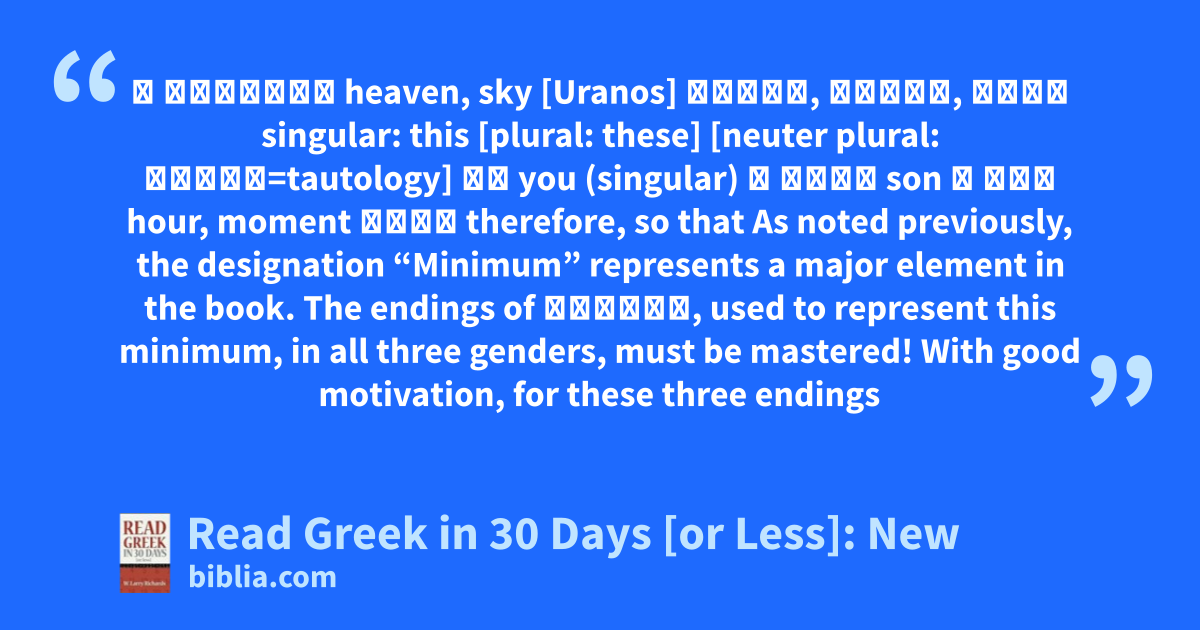 Are you a pastor wanting to brush up on Greek, a student taking Greek for the first time, or a layperson interested in learning the basics of Greek grammar? Read Greek in 30 Days or Less makes learning Greek easy and enjoyable if you have no previous knowledge of Greek! Its aim is to make the study of the New Testament clearer and to make Greek study more effective for pulpit or classroom...
