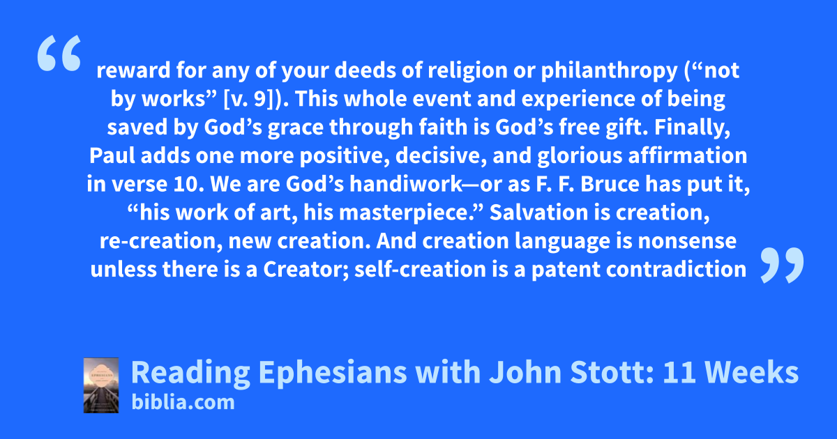 reward for any of your deeds of religion or philanthropy (“not by works” [v. 9]). This whole event and experience of being saved by God’s grace through faith is God’s free gift. Finally, Paul adds one more positive, decisive, and glorious affirmation in verse 10. We are God’s handiwork—or as F. F. Bruce has put it, “his work of art, his masterpiece.” Salvation is creation, re-creation, new creation. And creation language is nonsense unless there is a Creator; self-creation is a patent contradiction
