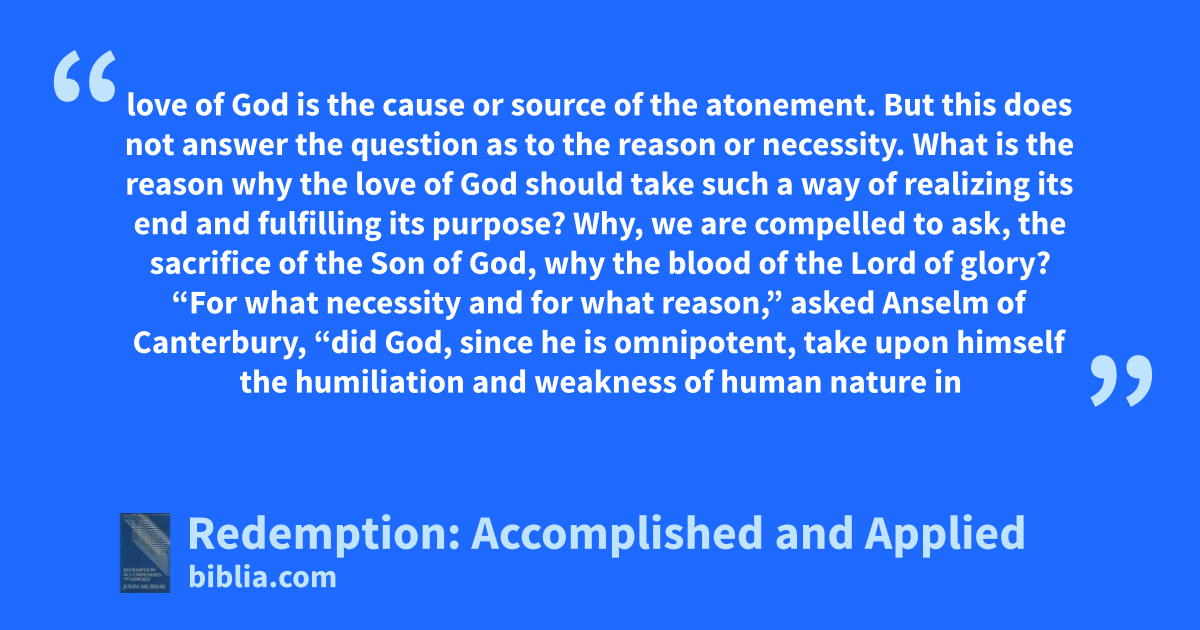 love of God is the cause or source of the atonement. But this does not answer the question as to the reason or necessity. What is the reason why the love of God should take such a way of realizing its end and fulfilling its purpose? Why, we are compelled to ask, the sacrifice of the Son of God, why the blood of the Lord of glory? “For what necessity and for what reason,” asked Anselm of Canterbury, “did God, since he is omnipotent, take upon himself the humiliation and weakness of human nature in