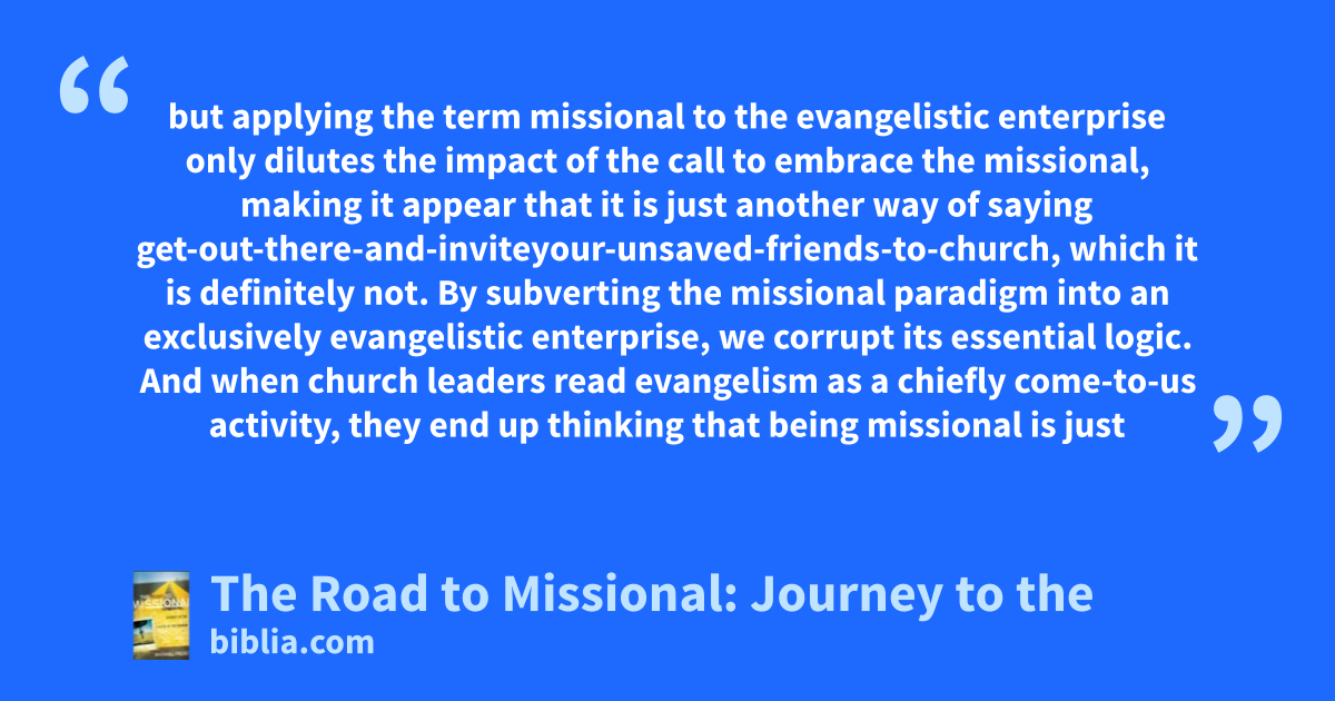 but applying the term missional to the evangelistic enterprise only dilutes the impact of the call to embrace the missional, making it appear that it is just another way of saying get-out-there-and-inviteyour-unsaved-friends-to-church, which it is definitely not. By subverting the missional paradigm into an exclusively evangelistic enterprise, we corrupt its essential logic. And when church leaders read evangelism as a chiefly come-to-us activity, they end up thinking that being missional is just