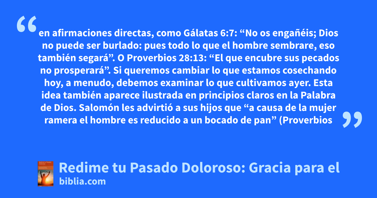 en afirmaciones directas, como Gálatas 6:7: “No os engañéis; Dios no puede ser burlado: pues todo lo que el hombre sembrare, eso también segará”. O Proverbios 28:13: “El que encubre sus pecados no prosperará”. Si queremos cambiar lo que estamos cosechando hoy, a menudo, debemos examinar lo que cultivamos ayer. Esta idea también aparece ilustrada en principios claros en la Palabra de Dios. Salomón les advirtió a sus hijos que “a causa de la mujer ramera el hombre es reducido a un bocado de pan” (Proverbios