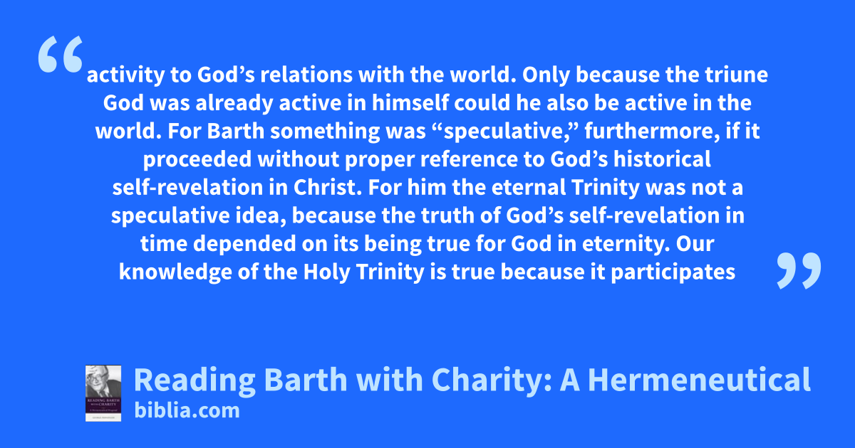 activity to God’s relations with the world. Only because the triune God was already active in himself could he also be active in the world. For Barth something was “speculative,” furthermore, if it proceeded without proper reference to God’s historical self-revelation in Christ. For him the eternal Trinity was not a speculative idea, because the truth of God’s self-revelation in time depended on its being true for God in eternity. Our knowledge of the Holy Trinity is true because it participates