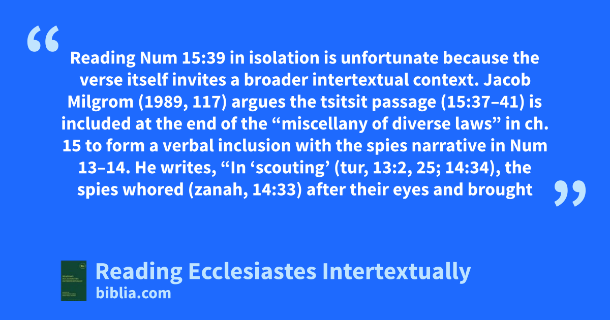 Reading Num 15:39 in isolation is unfortunate because the verse itself invites a broader intertextual context. Jacob Milgrom (1989, 117) argues the tsitsit passage (15:37–41) is included at the end of the “miscellany of diverse laws” in ch. 15 to form a verbal inclusion with the spies narrative in Num 13–14. He writes, “In ‘scouting’ (tur, 13:2, 25; 14:34), the spies whored (zanah, 14:33) after their eyes and brought