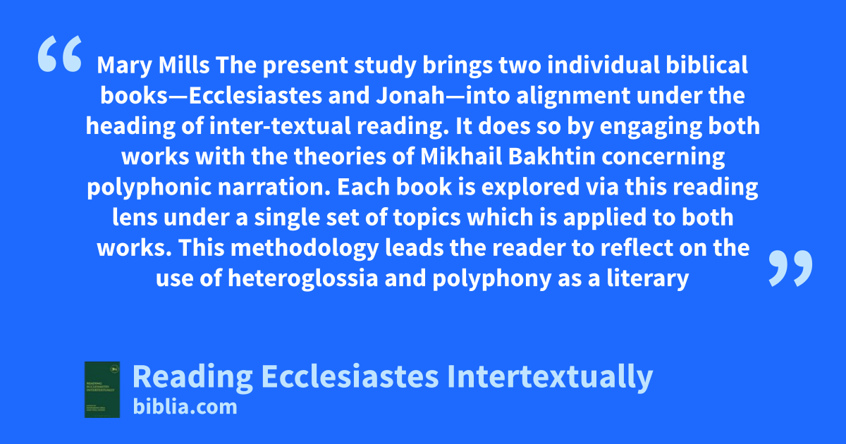 Mary Mills The present study brings two individual biblical books—Ecclesiastes and Jonah—into alignment under the heading of inter-textual reading. It does so by engaging both works with the theories of Mikhail Bakhtin concerning polyphonic narration. Each book is explored via this reading lens under a single set of topics which is applied to both works. This methodology leads the reader to reflect on the use of heteroglossia and polyphony as a literary